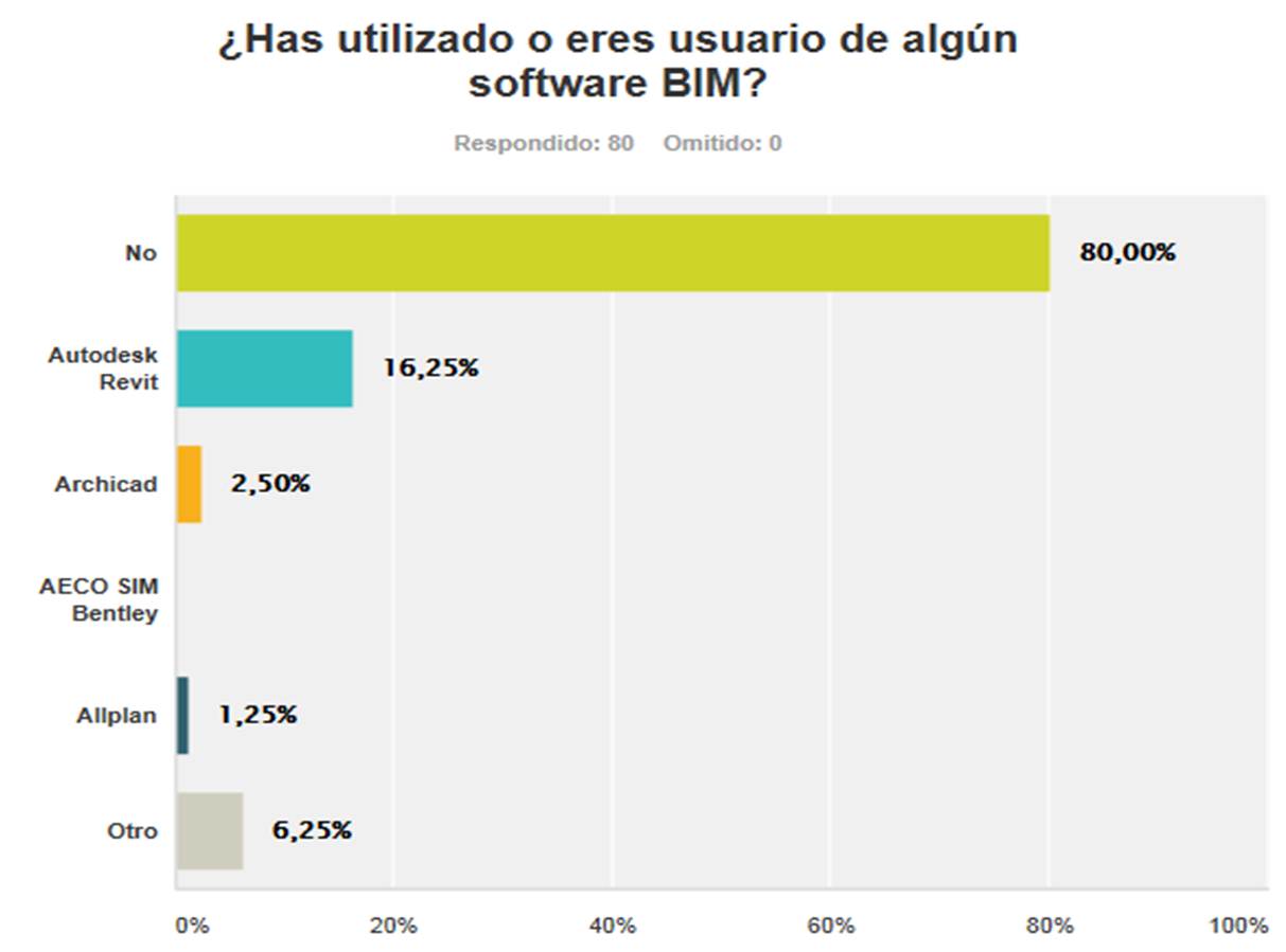 La segunda pregunta era sobre el software, y esta respuesta sí que fue clave, el 80% ni siquiera había utilizado software BIM en alguna ocasión. Entre los que sí conocían algún tipo de Software, Revit de Autodesk era el más conocido.
