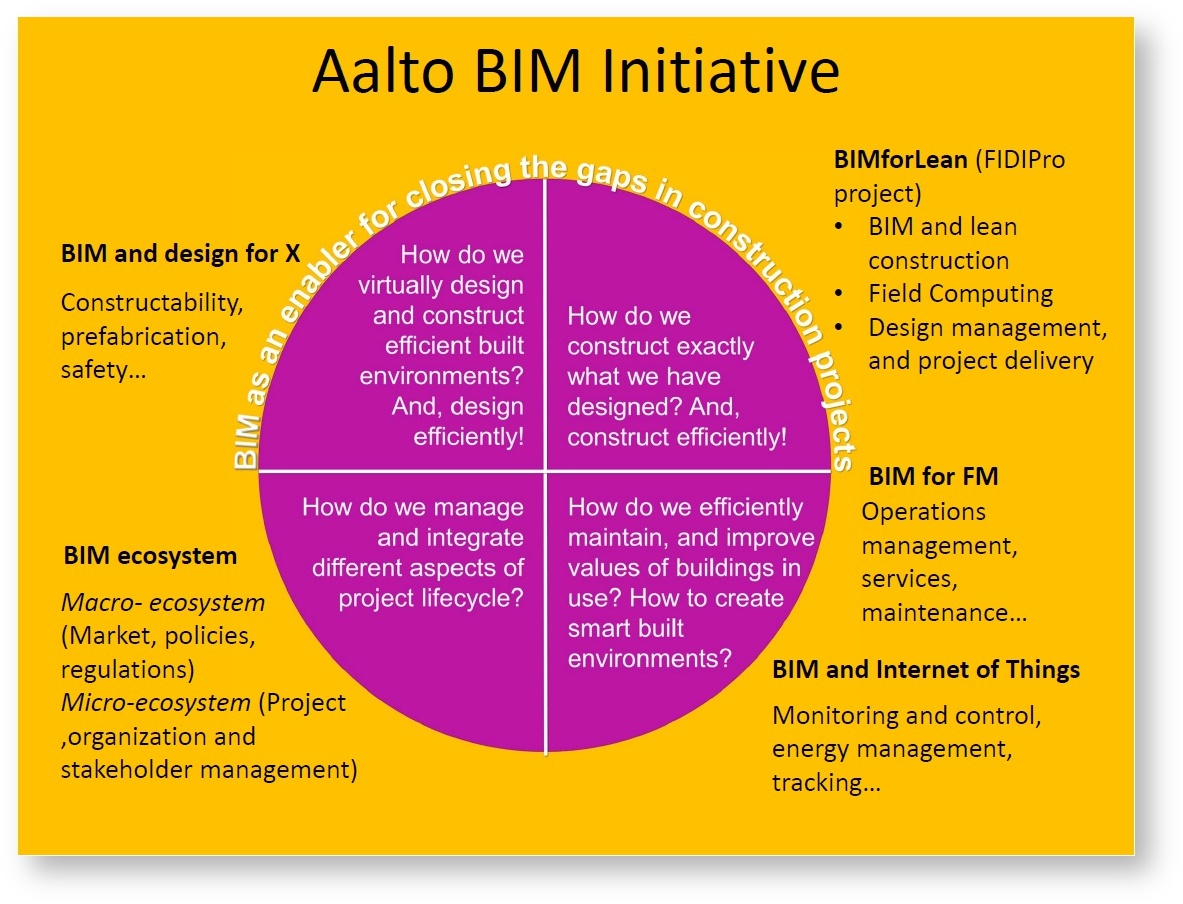 ” …The BIM initiative at Aalto University aims at combining established streams of research on BIM, design knowledge management, lean construction and service engineering and management to realize the promise of BIM in improving operational effectiveness and performance over the life-cycle of the built environment”.